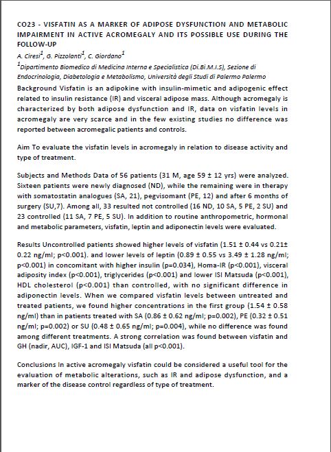 Ciresi, A., Pizzolanti, G., Giordano, C. (2015). Visfatin as a marker of adipose dysfunction and metabolic impairment in active acromegaly and its possible use during the follow-up. In ABSTRACT BOOK • 38° Congresso Nazionale SIE (Società Italiana di Endocrinologia.